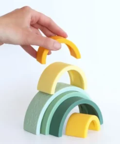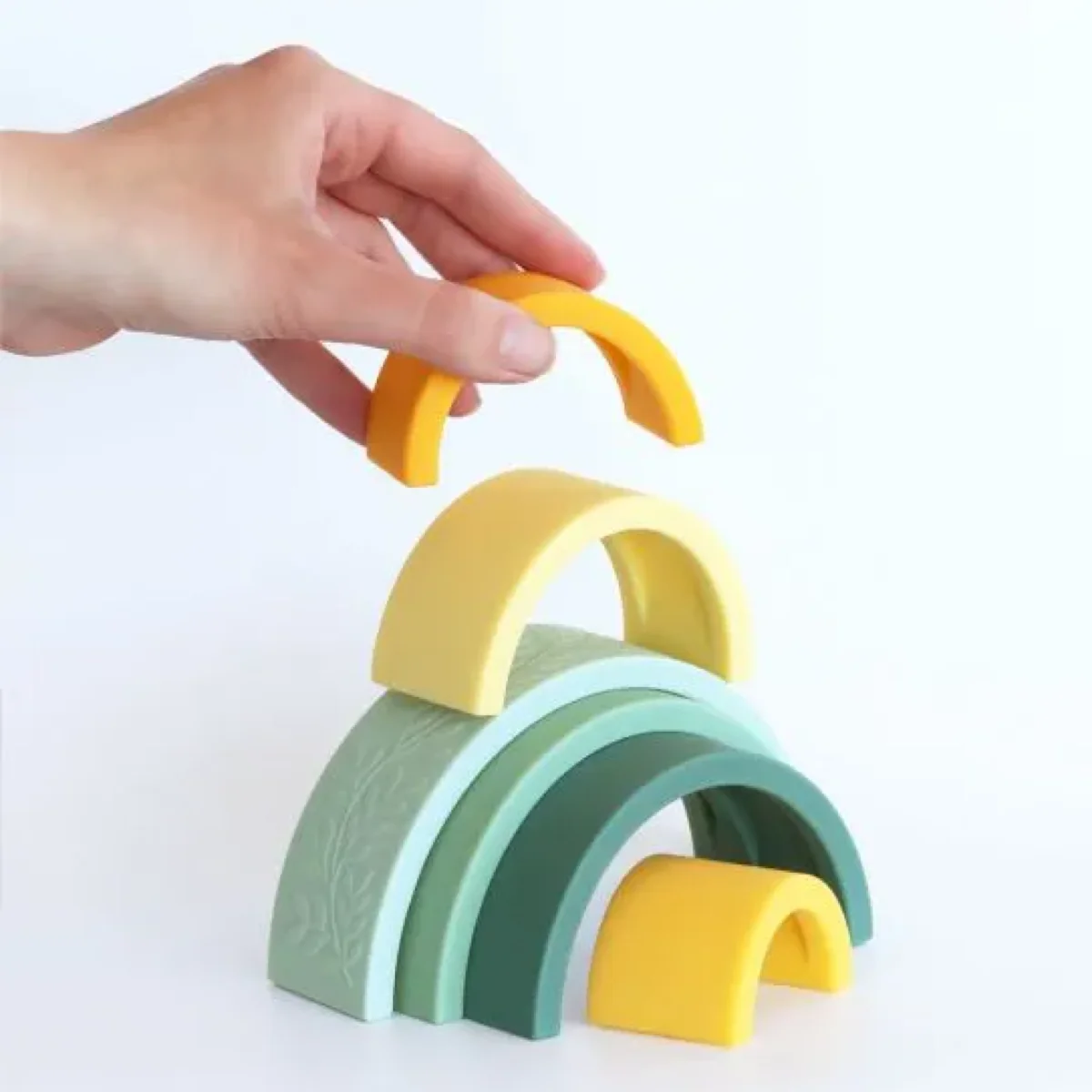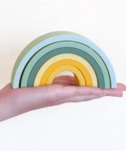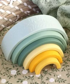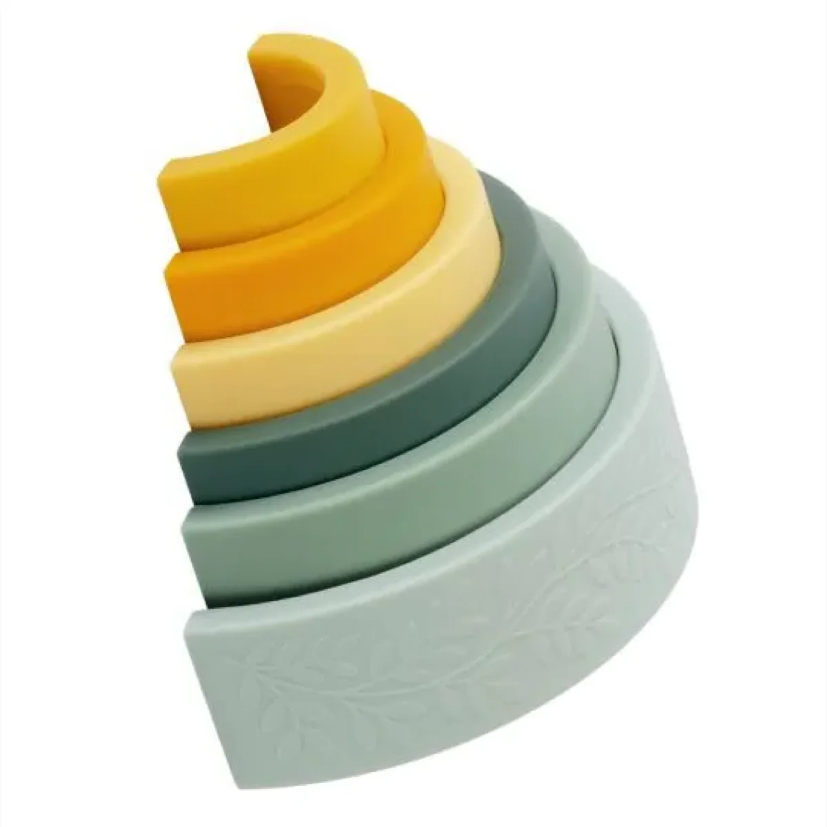 Juguete apilable de arco iris de silicona con un hermoso diseño de hojas en el anillo exterior. Se puede utilizar tanto para jugar en interiores como en exteriores o como juguete de baño para niños de todas las edades, incluidos los bebés. El diseño minimalista facilita el juego abierto; ¡Puedes apilar, armar rompecabezas, construir, equilibrar e incluso masticar las piezas! Al estar hecho de silicona, el juguete es súper duradero y fácil de limpiar.