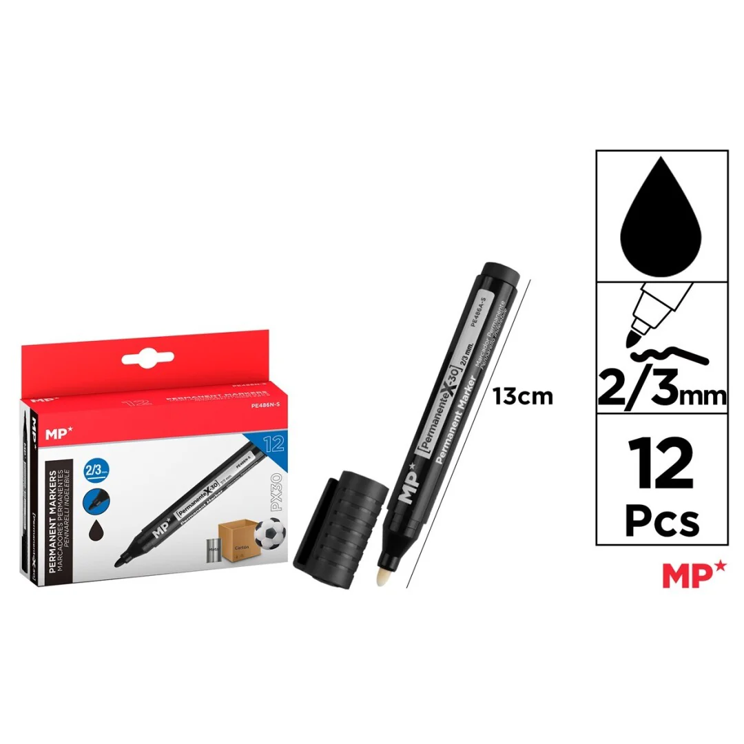 Marcador X-30 con cuerpo de plástico y capuchón con clip de sujeción del color de la tinta. Tinta permanente indeleble no tóxica, apta para multitud de superficies. Puede estar hasta una semana destapado sin secarse. Punta de fibra redonda de 2-3 mm de grosor. Tamano 130 mm. Color negro.