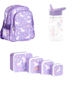 Conjunto que incluye una mochila pequeña de la colección Unicorn, una botella de acero y un tupper Unicorn Little. Perfecto para quienes prefieren la practicidad diaria.