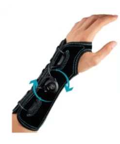 Muñequera ortopédica realizada con tejido de trama diferenciada con ballena palmar anatómica y correa elástica de cierre para regular la compresión.