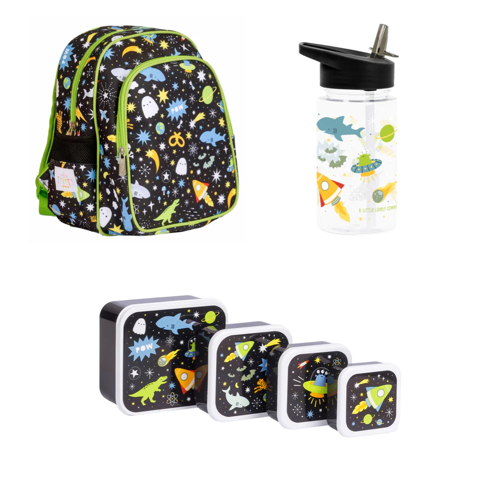 Pack Mochila Grande Galaxy Botella Galaxy y Lunch & Snackbox Galaxy para Niños